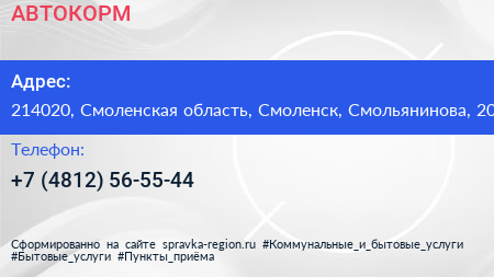 АВТОКОРМ по адресу 214020, Смоленская область, Смоленск, Смольянинова, 20 в дальнейшем Организация, размещена в следующих категориях: