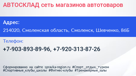 АВТОСКЛАД, сеть магазинов автотоваров по адресу 214020, Смоленская область, Смоленск, Шевченко, 86Б в дальнейшем Организация, размещена в следующих категориях: