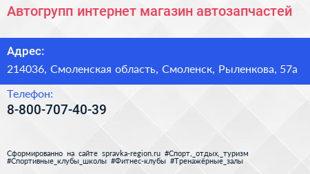 Автогрупп, интернет-магазин автозапчастей по адресу 214036, Смоленская область, Смоленск, Рыленкова, 57а в дальнейшем Организация, размещена в следующих категориях: