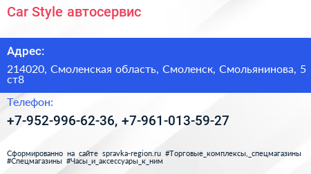 Car Style, автосервис по адресу 214020, Смоленская область, Смоленск, Смольянинова, 5 ст8 в дальнейшем Организация, размещена в следующих категориях: