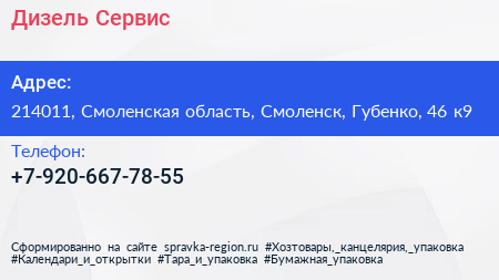 Дизель Сервис по адресу 214011, Смоленская область, Смоленск, Губенко, 46 к9 в дальнейшем Организация, размещена в следующих категориях: