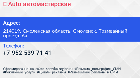 E Auto, автомастерская по адресу 214019, Смоленская область, Смоленск, Трамвайный проезд, 6а в дальнейшем Организация, размещена в следующих категориях: