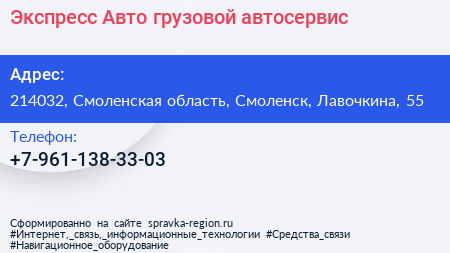 Экспресс-Авто, грузовой автосервис по адресу 214032, Смоленская область, Смоленск, Лавочкина, 55 в дальнейшем Организация, размещена в следующих категориях: