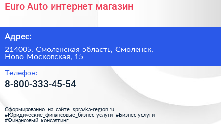 Euro Auto, интернет-магазин по адресу 214005, Смоленская область, Смоленск, Ново-Московская, 15 в дальнейшем Организация, размещена в следующих категориях: