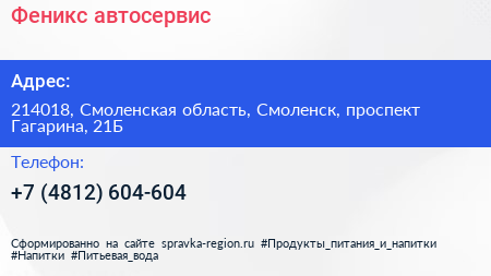 Феникс, автосервис по адресу 214018, Смоленская область, Смоленск, проспект Гагарина, 21Б в дальнейшем Организация, размещена в следующих категориях: