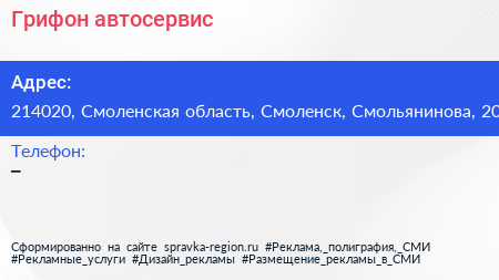 Грифон, автосервис по адресу 214020, Смоленская область, Смоленск, Смольянинова, 20 в дальнейшем Организация, размещена в следующих категориях:
