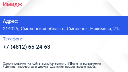 Имидж по адресу 214025, Смоленская область, Смоленск, Нахимова, 21а в дальнейшем Организация, размещена в следующих категориях: