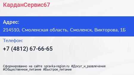 КарданСервис67 по адресу 214510, Смоленская область, Смоленск, Викторова, 1Б в дальнейшем Организация, размещена в следующих категориях: