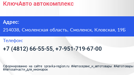КлючАвто, автокомплекс по адресу 214038, Смоленская область, Смоленск, Кловская, 19Б в дальнейшем Организация, размещена в следующих категориях: