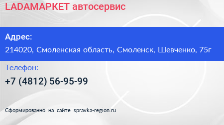 LADAМАРКЕТ, автосервис по адресу 214020, Смоленская область, Смоленск, Шевченко, 75г в дальнейшем Организация, размещена в следующих категориях: