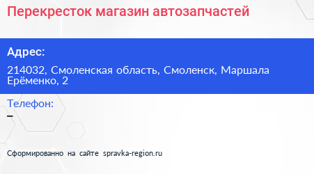 Перекресток, магазин автозапчастей по адресу 214032, Смоленская область, Смоленск, Маршала Ерёменко, 2 в дальнейшем Организация, размещена в следующих категориях: