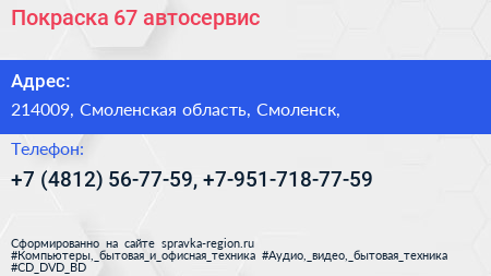 Покраска 67, автосервис по адресу 214009, Смоленская область, Смоленск, в дальнейшем Организация, размещена в следующих категориях:
