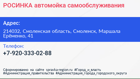 РОСИНКА, автомойка самообслуживания по адресу 214032, Смоленская область, Смоленск, Маршала Ерёменко, 41 в дальнейшем Организация, размещена в следующих категориях: