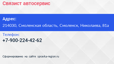 Связист, автосервис по адресу 214030, Смоленская область, Смоленск, Николаева, 81а в дальнейшем Организация, размещена в следующих категориях: