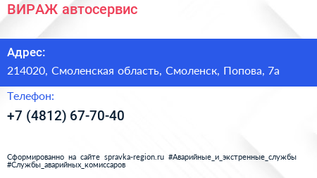 ВИРАЖ, автосервис по адресу 214020, Смоленская область, Смоленск, Попова, 7а в дальнейшем Организация, размещена в следующих категориях: