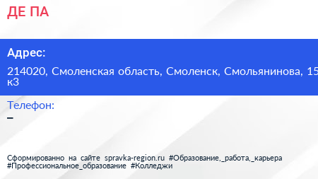 ДЕ-ПА по адресу 214020, Смоленская область, Смоленск, Смольянинова, 15 к3 в дальнейшем Организация, размещена в следующих категориях: