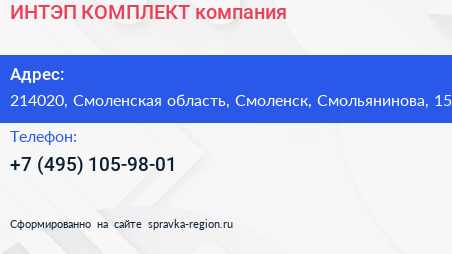 ИНТЭП КОМПЛЕКТ, компания по адресу 214020, Смоленская область, Смоленск, Смольянинова, 15 в дальнейшем Организация, размещена в следующих категориях: