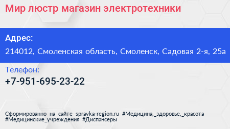 Мир люстр, магазин электротехники по адресу 214012, Смоленская область, Смоленск, Садовая 2-я, 25а в дальнейшем Организация, размещена в следующих категориях:
