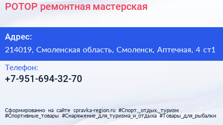 РОТОР, ремонтная мастерская по адресу 214019, Смоленская область, Смоленск, Аптечная, 4 ст1 в дальнейшем Организация, размещена в следующих категориях: