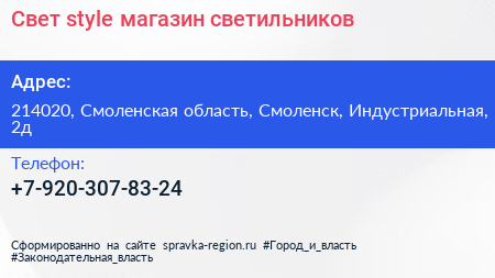 Свет style, магазин светильников по адресу 214020, Смоленская область, Смоленск, Индустриальная, 2д в дальнейшем Организация, размещена в следующих категориях: