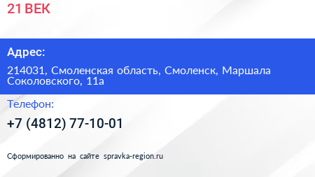21 ВЕК по адресу 214031, Смоленская область, Смоленск, Маршала Соколовского, 11а в дальнейшем Организация, размещена в следующих категориях: