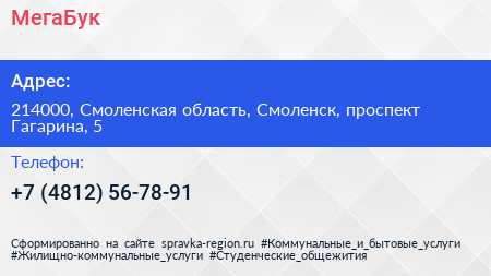 МегаБук по адресу 214000, Смоленская область, Смоленск, проспект Гагарина, 5 в дальнейшем Организация, размещена в следующих категориях: