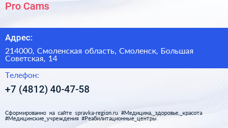 Pro-Cams по адресу 214000, Смоленская область, Смоленск, Большая Советская, 14 в дальнейшем Организация, размещена в следующих категориях: