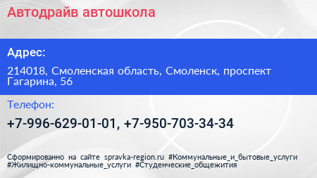 Автодрайв, автошкола по адресу 214018, Смоленская область, Смоленск, проспект Гагарина, 56 в дальнейшем Организация, размещена в следующих категориях:
