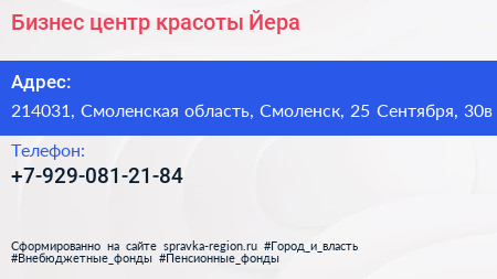 Бизнес-центр красоты Йера по адресу 214031, Смоленская область, Смоленск, 25 Сентября, 30в в дальнейшем Организация, размещена в следующих категориях: