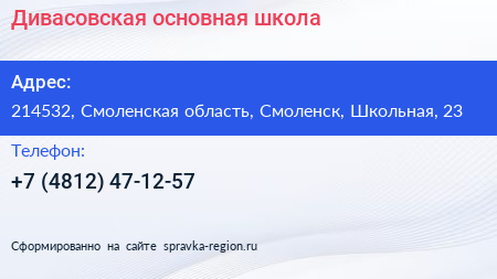 Дивасовская основная школа по адресу 214532, Смоленская область, Смоленск, Школьная, 23 в дальнейшем Организация, размещена в следующих категориях: