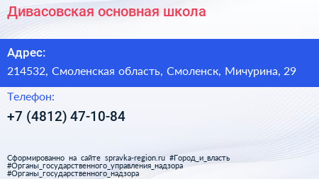 Дивасовская основная школа по адресу 214532, Смоленская область, Смоленск, Мичурина, 29 в дальнейшем Организация, размещена в следующих категориях: