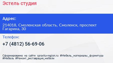 Эстель, студия по адресу 214018, Смоленская область, Смоленск, проспект Гагарина, 30 в дальнейшем Организация, размещена в следующих категориях: