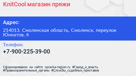 KnitCool, магазин пряжи по адресу 214013, Смоленская область, Смоленск, переулок Юннатов, 4 в дальнейшем Организация, размещена в следующих категориях:
