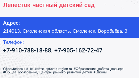 Лепесток, частный детский сад по адресу 214013, Смоленская область, Смоленск, Воробьёва, 3 в дальнейшем Организация, размещена в следующих категориях: