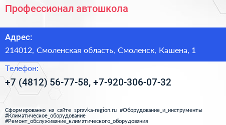 Профессионал, автошкола по адресу 214012, Смоленская область, Смоленск, Кашена, 1 в дальнейшем Организация, размещена в следующих категориях:
