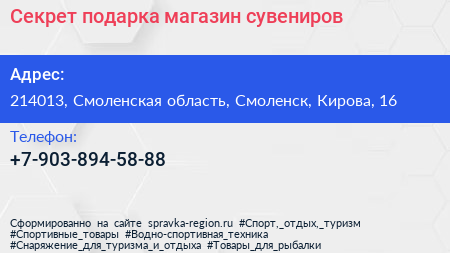 Секрет подарка, магазин сувениров по адресу 214013, Смоленская область, Смоленск, Кирова, 16 в дальнейшем Организация, размещена в следующих категориях: