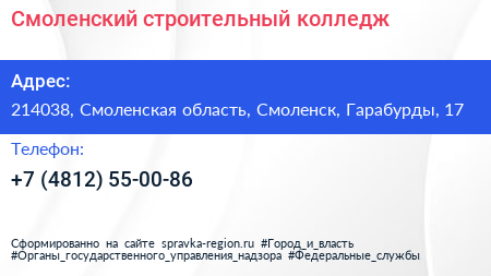 Смоленский строительный колледж по адресу 214038, Смоленская область, Смоленск, Гарабурды, 17 в дальнейшем Организация, размещена в следующих категориях: