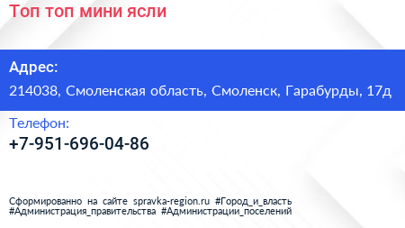 Топ-топ, мини-ясли по адресу 214038, Смоленская область, Смоленск, Гарабурды, 17д в дальнейшем Организация, размещена в следующих категориях: