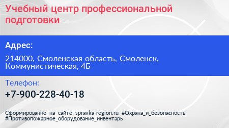 Учебный центр профессиональной подготовки по адресу 214000, Смоленская область, Смоленск, Коммунистическая, 4Б в дальнейшем Организация, размещена в следующих категориях: