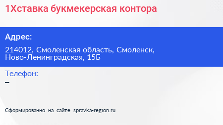 1Xставка, букмекерская контора по адресу 214012, Смоленская область, Смоленск, Ново-Ленинградская, 15Б в дальнейшем Организация, размещена в следующих категориях: