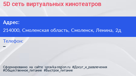 5D, сеть виртуальных кинотеатров по адресу 214000, Смоленская область, Смоленск, Ленина, 2д в дальнейшем Организация, размещена в следующих категориях: