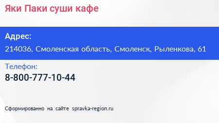 Яки Паки, суши-кафе по адресу 214036, Смоленская область, Смоленск, Рыленкова, 61 в дальнейшем Организация, размещена в следующих категориях:
