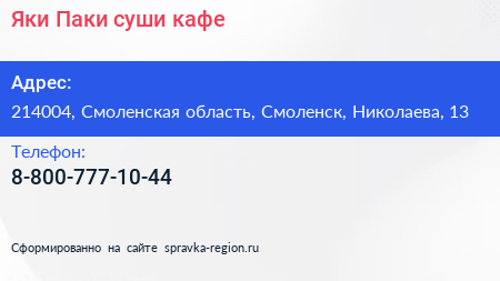 Яки Паки, суши-кафе по адресу 214004, Смоленская область, Смоленск, Николаева, 13 в дальнейшем Организация, размещена в следующих категориях: