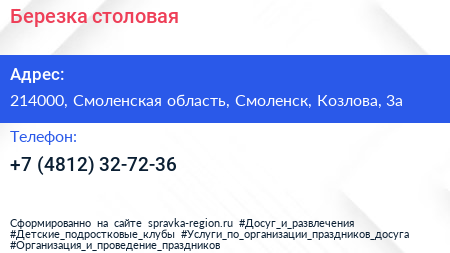 Березка, столовая по адресу 214000, Смоленская область, Смоленск, Козлова, 3а в дальнейшем Организация, размещена в следующих категориях: