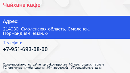 Чайхана, кафе по адресу 214030, Смоленская область, Смоленск, Нормандия-Неман, 6 в дальнейшем Организация, размещена в следующих категориях: