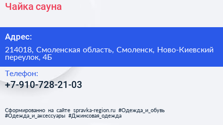 Чайка, сауна по адресу 214018, Смоленская область, Смоленск, Ново-Киевский переулок, 4Б в дальнейшем Организация, размещена в следующих категориях: