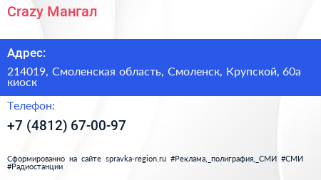 Crazy Мангал по адресу 214019, Смоленская область, Смоленск, Крупской, 60а киоск в дальнейшем Организация, размещена в следующих категориях: