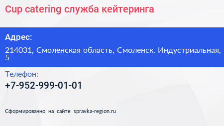 Cup catering, служба кейтеринга по адресу 214031, Смоленская область, Смоленск, Индустриальная, 5 в дальнейшем Организация, размещена в следующих категориях: