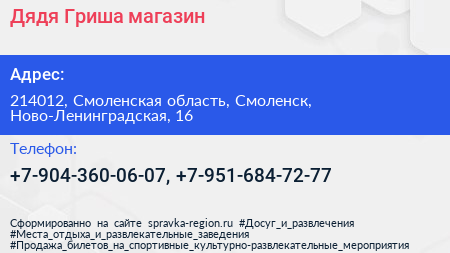 Дядя Гриша, магазин по адресу 214012, Смоленская область, Смоленск, Ново-Ленинградская, 16 в дальнейшем Организация, размещена в следующих категориях: