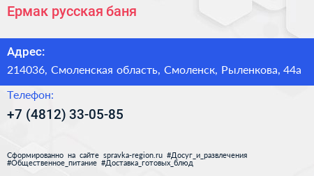 Ермак, русская баня по адресу 214036, Смоленская область, Смоленск, Рыленкова, 44а в дальнейшем Организация, размещена в следующих категориях: